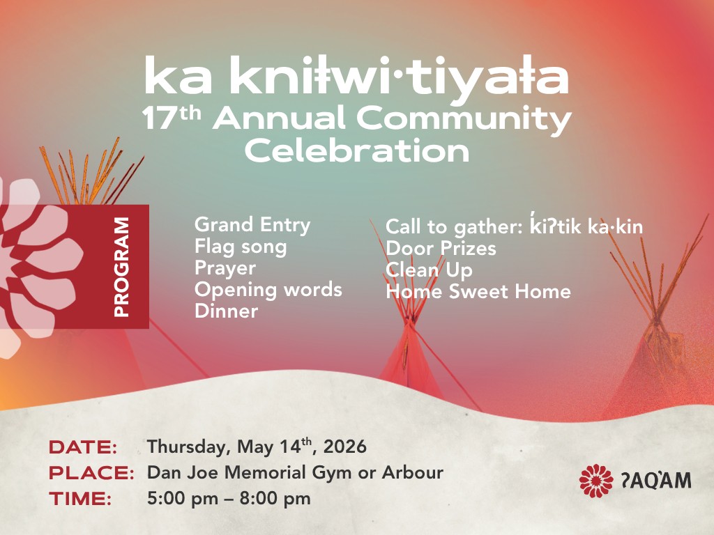 Join us Thursday, May 14, 2026, at 5:00 p.m. at the Dan Joe Memorial Gym for an evening of food, laughter, and celebration as we honour ʔaq̓amnik success. Please wear your regalia if you plan on joining Grand Entry. Everyone is welcome! For more information or to reserve your seat email bharvey@aqam.net or call Bonnie […] |