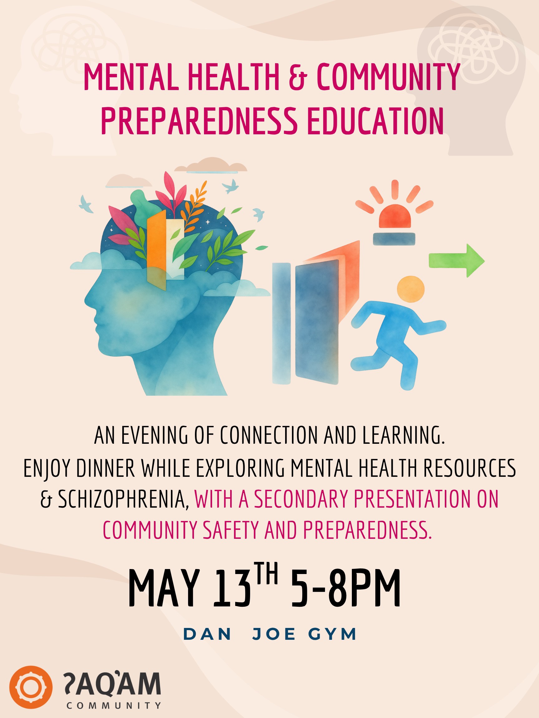 An evening of connection and learning. Enjoy dinner while exploring mental health resources & schizophrenia, with a secondary presentation on community safety and preparedness. Wednesday, May 13, 5 – 8pm Dan Joe Memorial Gym |