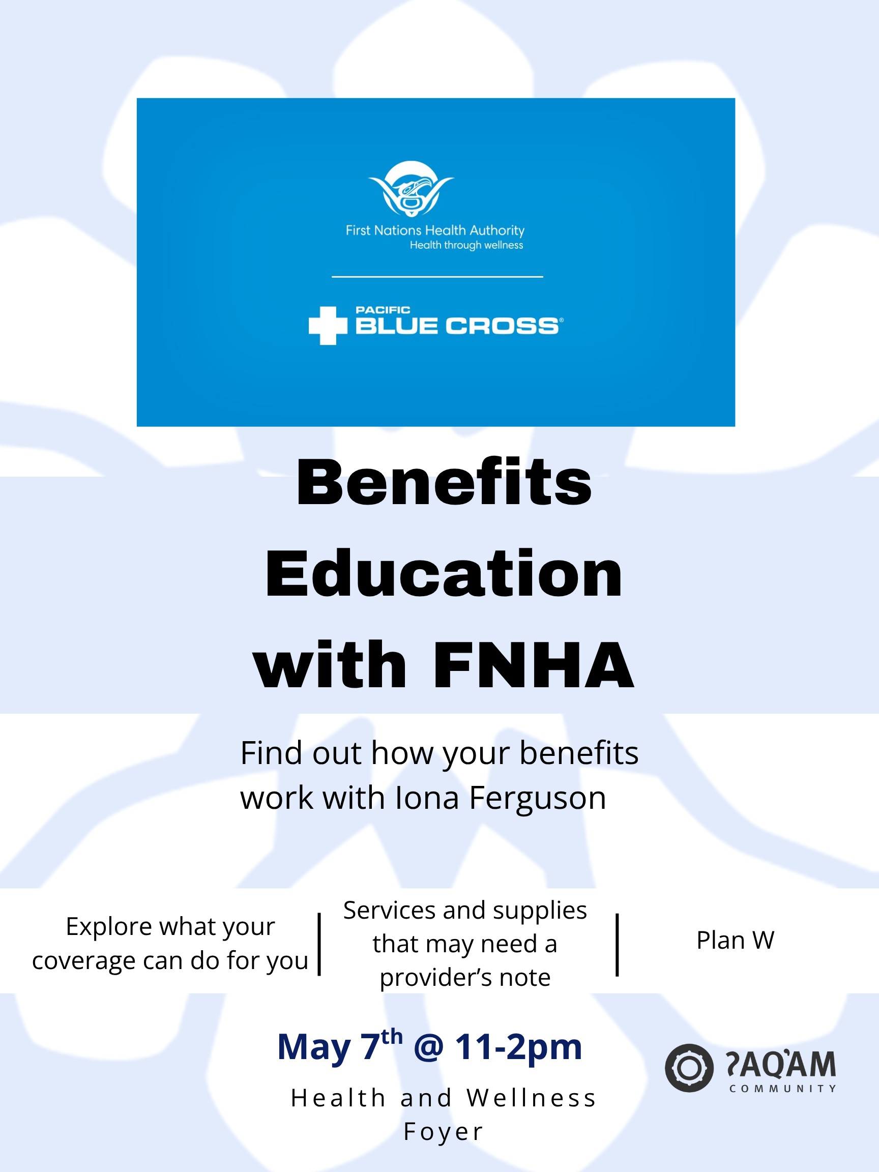 Wanting to find out more about your benefits? Join us for Benefits Education with the First Nation Health Authority (FNHA) - Explore what your coverage can do - Services and supplies that may need a provider's note - Plan W Thursday, May 7th @ 11 – 2 pm Health and Wellness Foyer |