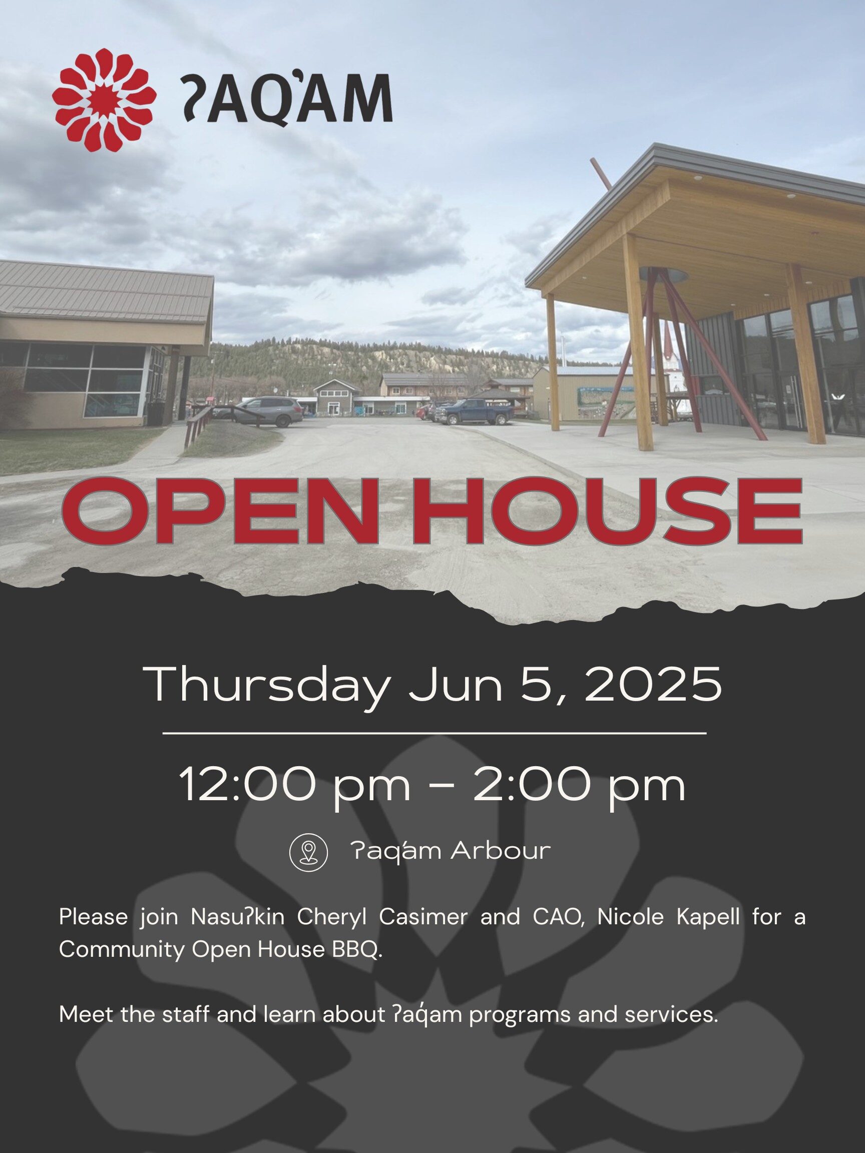 Please join Nasuʔkin Cheryl Casimer and CAO, Nicole Kapell for a Community Open House BBQ.