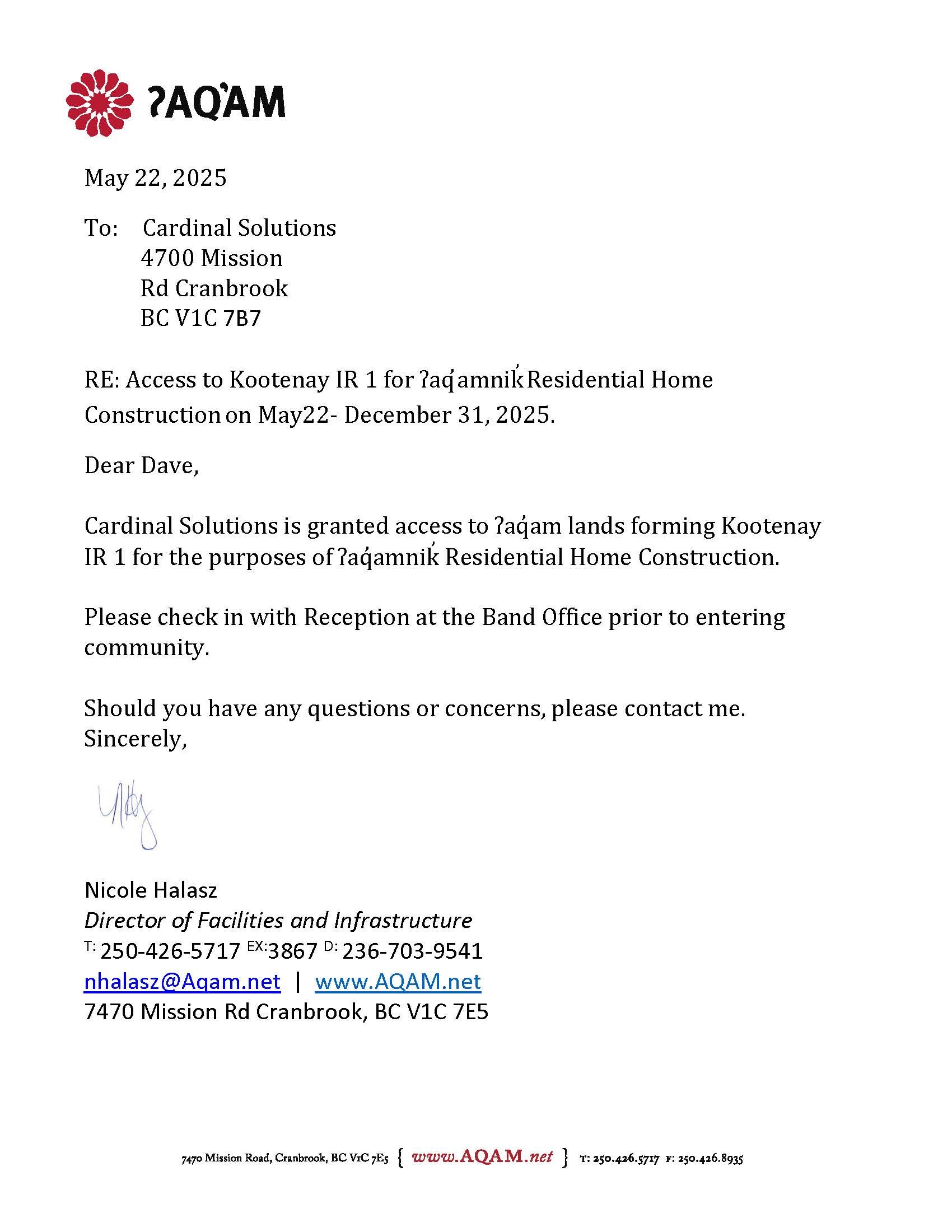 Cardinal Solutions is granted access to ʔaq̓am lands forming Kootenay IR 1 for the purposes of ʔaq̓amnik̓ Residential Home Construction.