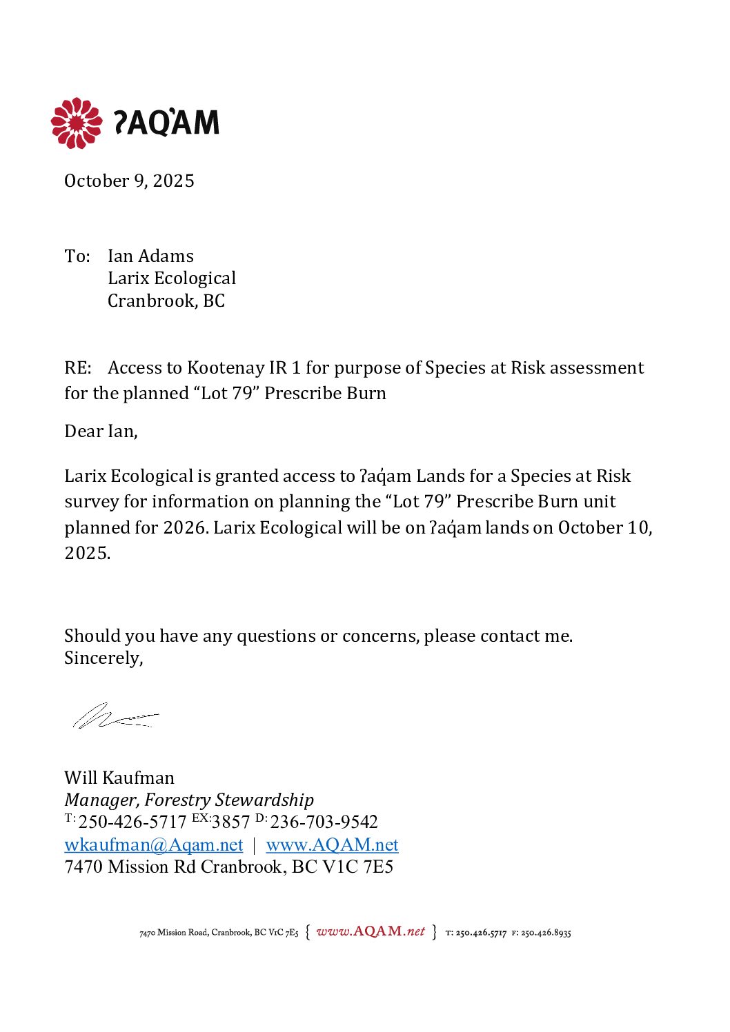 Larix Ecological is granted access to ʔaq̓am Lands for a Species at Risk survey for information on planning the “Lot 79” Prescribe Burn unit planned for 2026. Larix Ecological will be on ʔaq̓am lands on October 10, 2025.