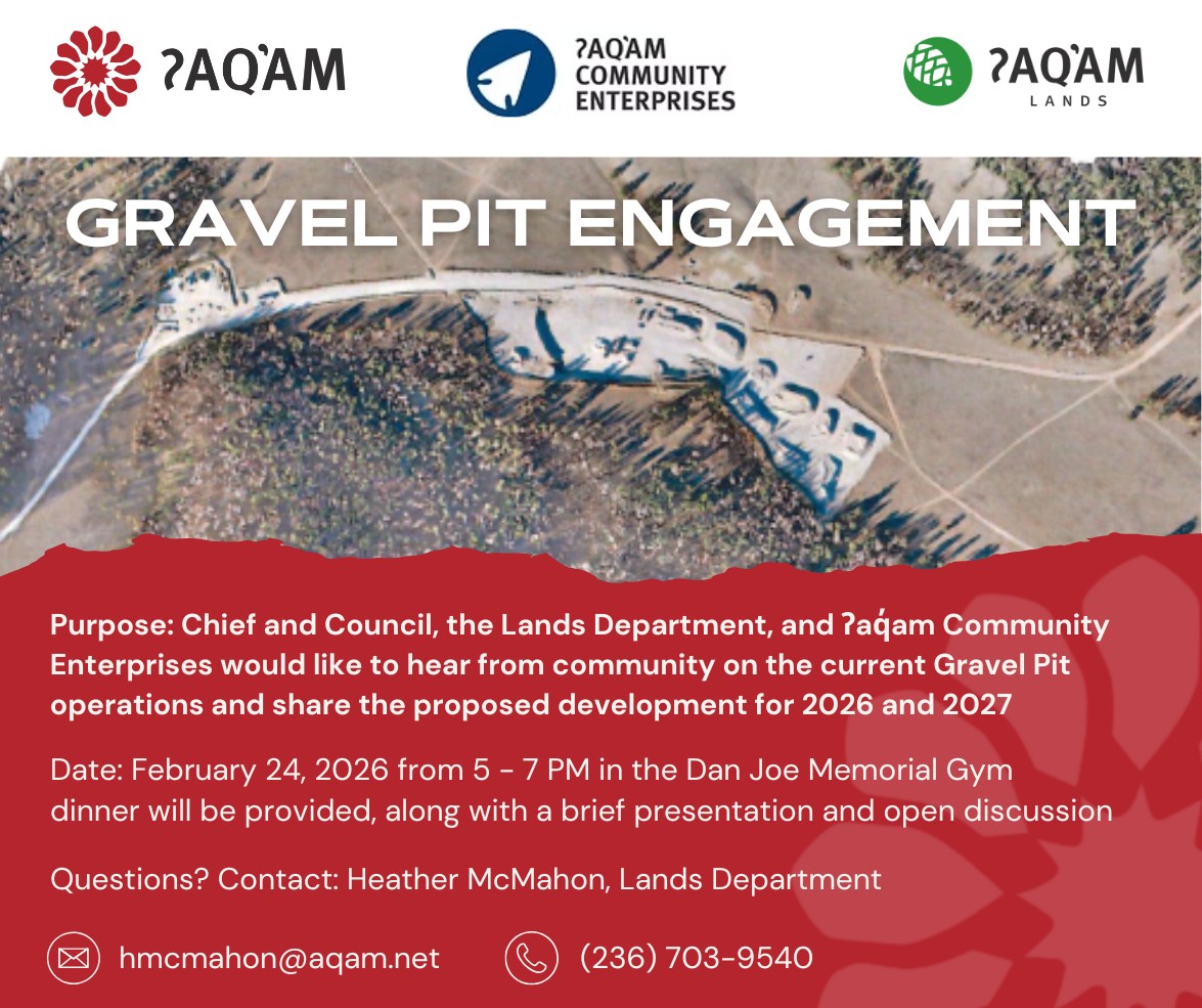 Purpose: Chief and Council, the Lands Department, and ʔaq̓am Community Enterprises (ACE) would like to hear from the community on the current Gravel Pit operations and share the proposed development for 2026 and 2027.