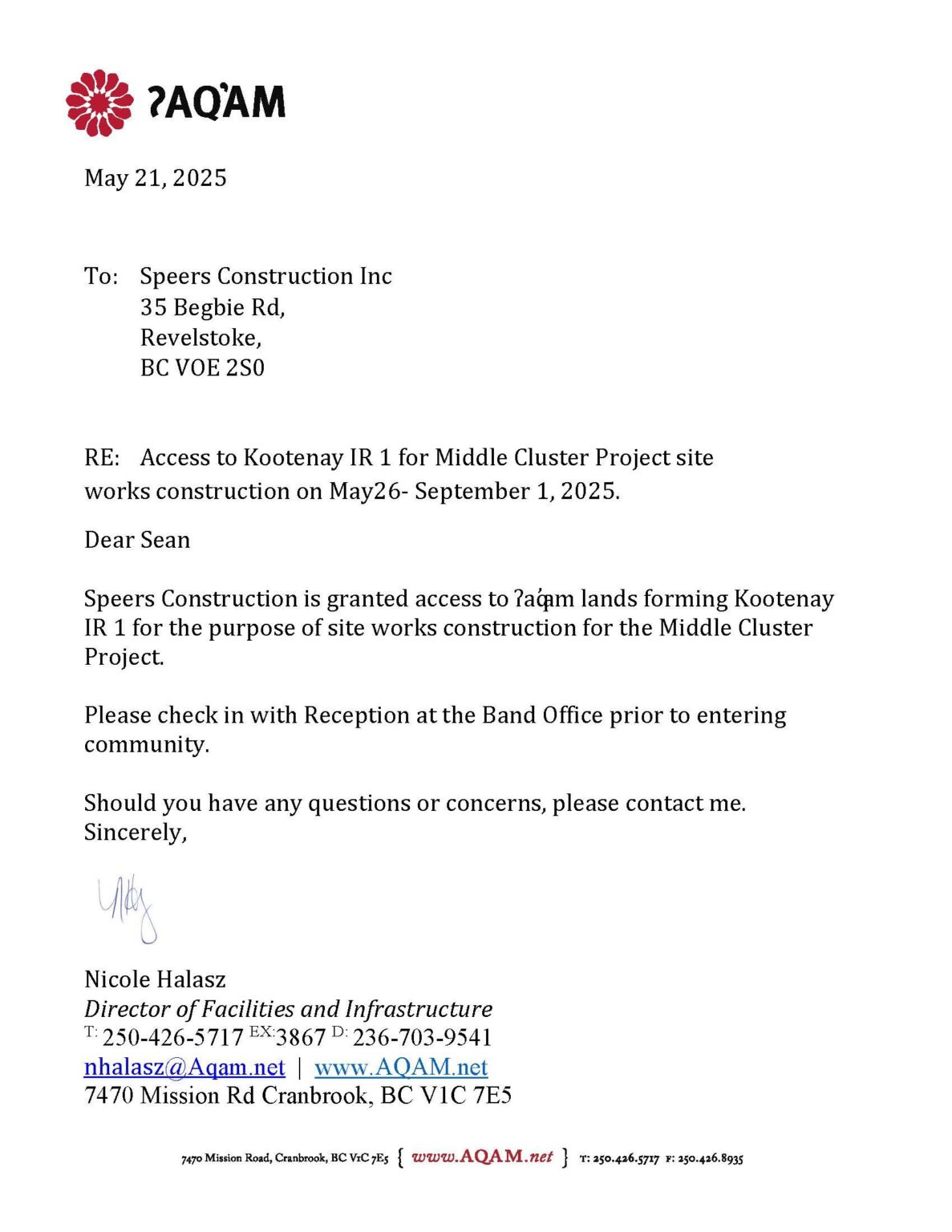 Speers Construction is granted access to ʔaq̓am lands forming Kootenay IR 1 for the purpose of site works construction for the Middle Cluster Project.