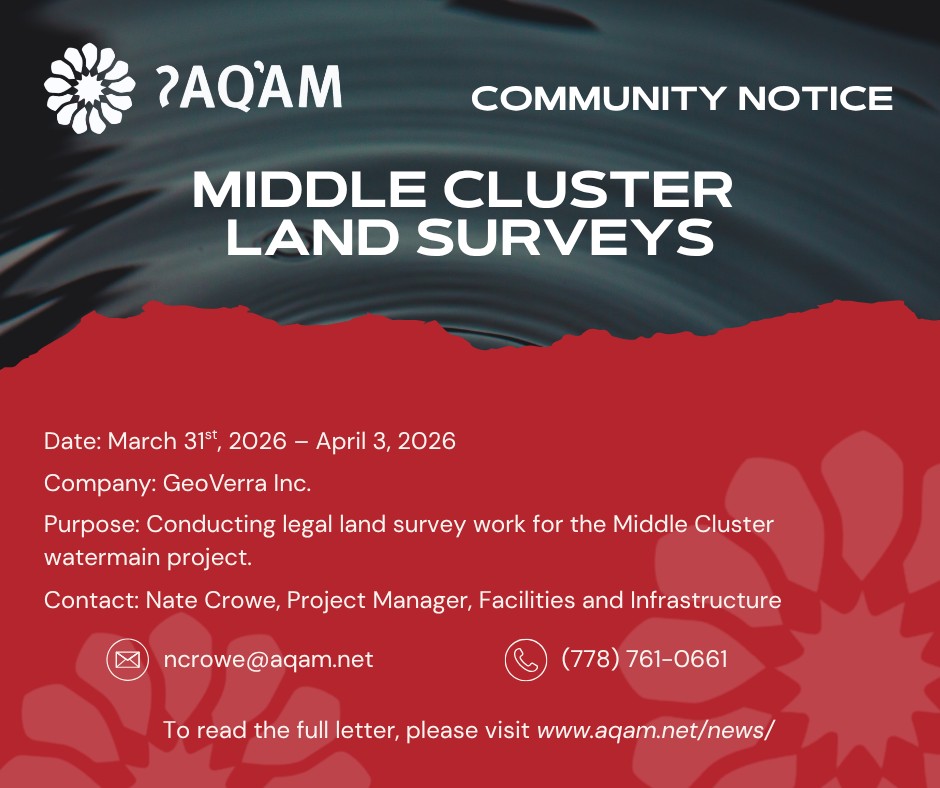 GeoVerra Inc. will be on reserve on March 31st, 2026 conducting legal land survey work on the North East end of the reserve lands to confirm and verify property lines in relation to Middle Cluster watermain expansion design from the Middle Cluster project to service 13 additional lots to the North East. This contractor will be on site until April 3rd, 2026.