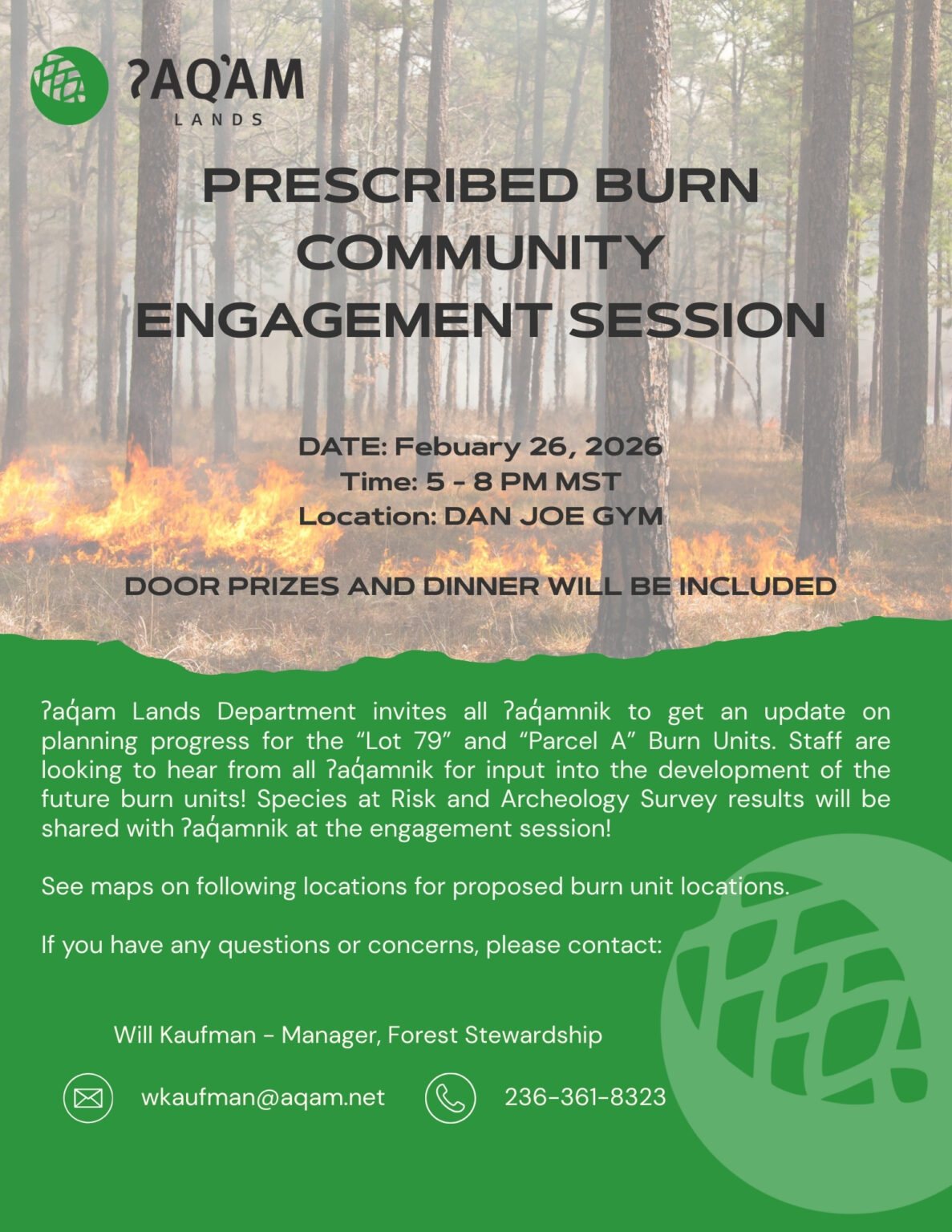 On February 26th, the Lands Department will be providing an update on planning process for “Lot 79” and “Parcel A” Burn Units. We want to hear input from all ʔaq̓amnik̓ on the development of future burn units!