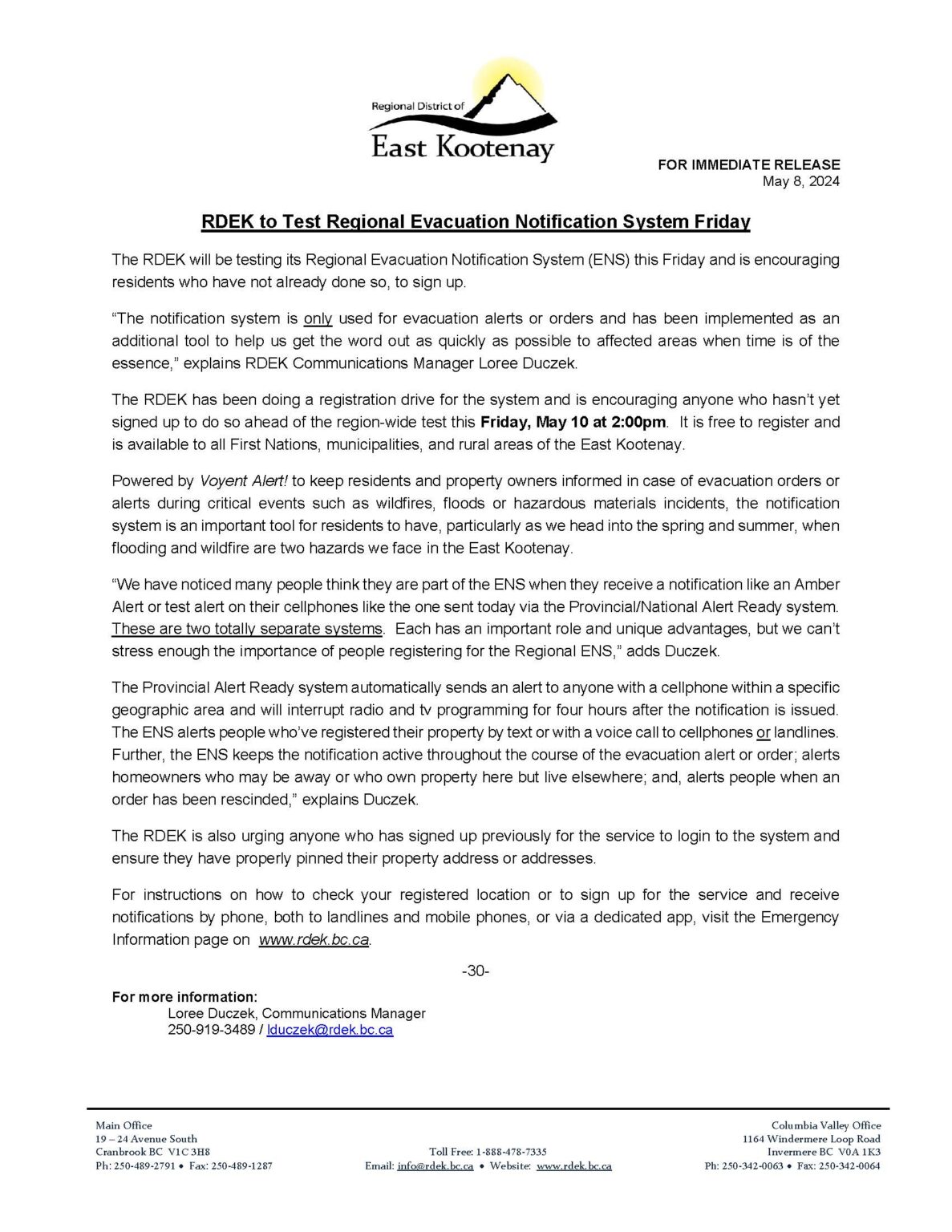 The RDEK will be testing its Regional Evacuation Notification System (ENS) this Friday and is encouraging residents who have not already done so, to sign up.